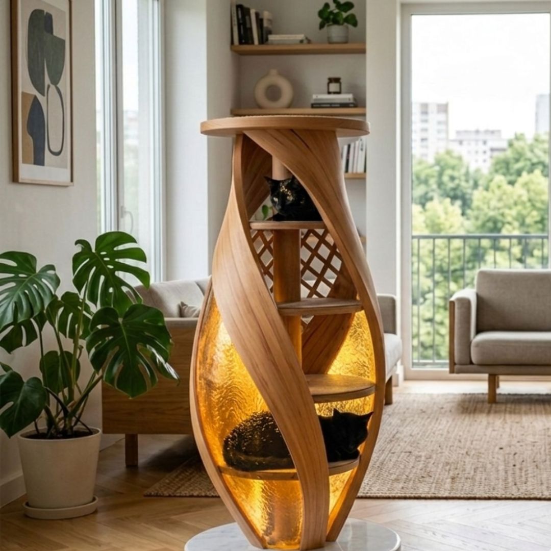 Inspiré par les formes fluides de la nature, le Solis se compose de courbes élégantes en hêtre massif cintré. Sa structure en spirale abrite un cœur de résine ambrée translucide, qui capture la lumière naturelle pour créer un cocon chaleureux et protecteur. À travers ses parois texturées, observez la silhouette de votre chat évoluer avec grâce, comme dans une chrysalide de lumière.