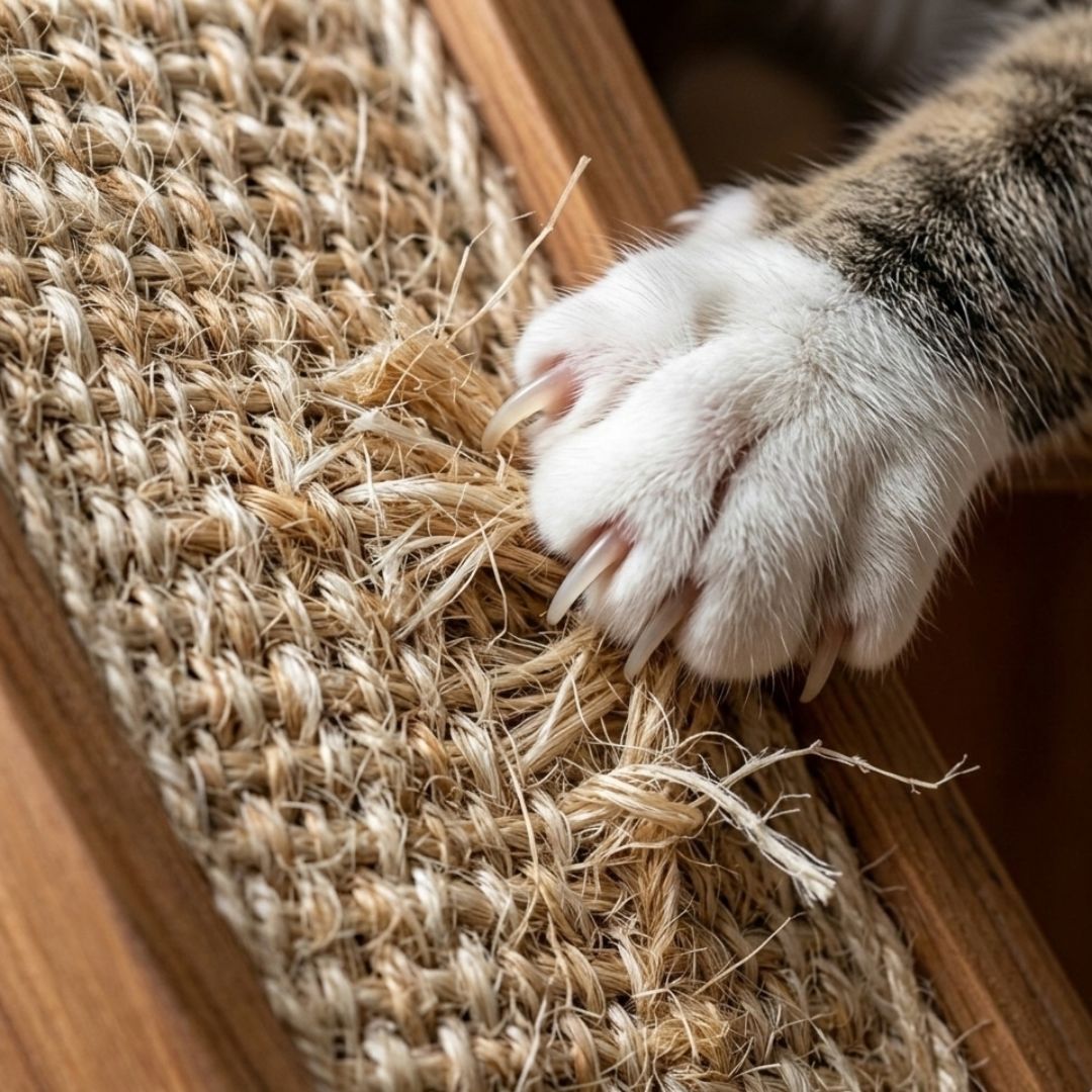 Le tressage artisanal en rotin, associé à la plateforme supérieure en sisal tissé à plat, offre des textures irrésistibles pour le griffage naturel et le développement de l’agilité.